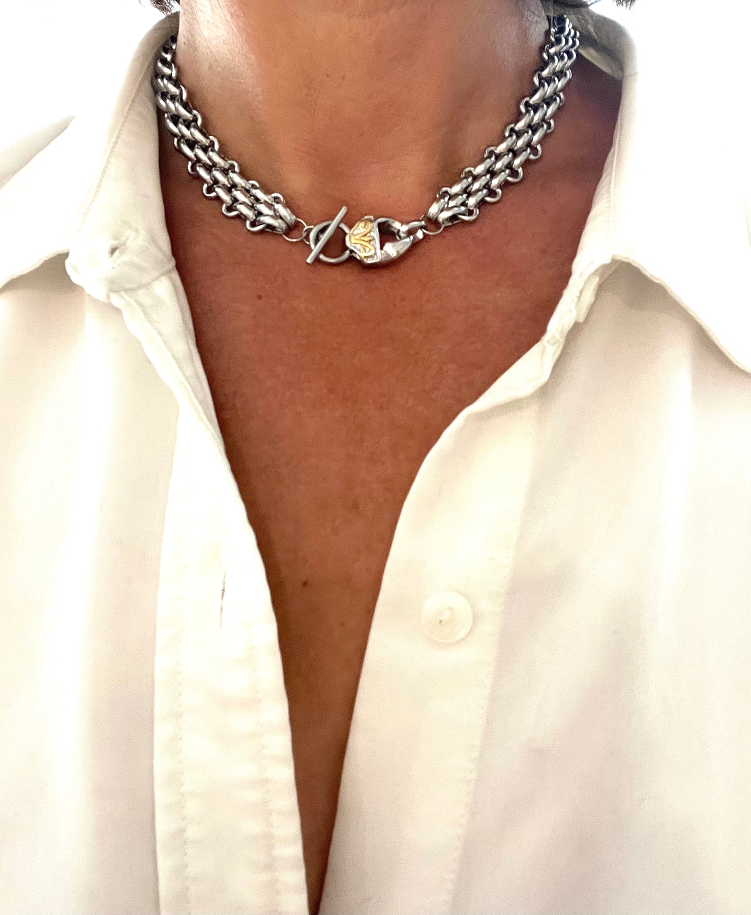 Add timeless elegance with extra bubbly and a hint of modern chic with our Champagne Chain. This beauty is handcrafted out of multiple stainless steel links and finished with our luxury mixed metal button, plus toggle closure.